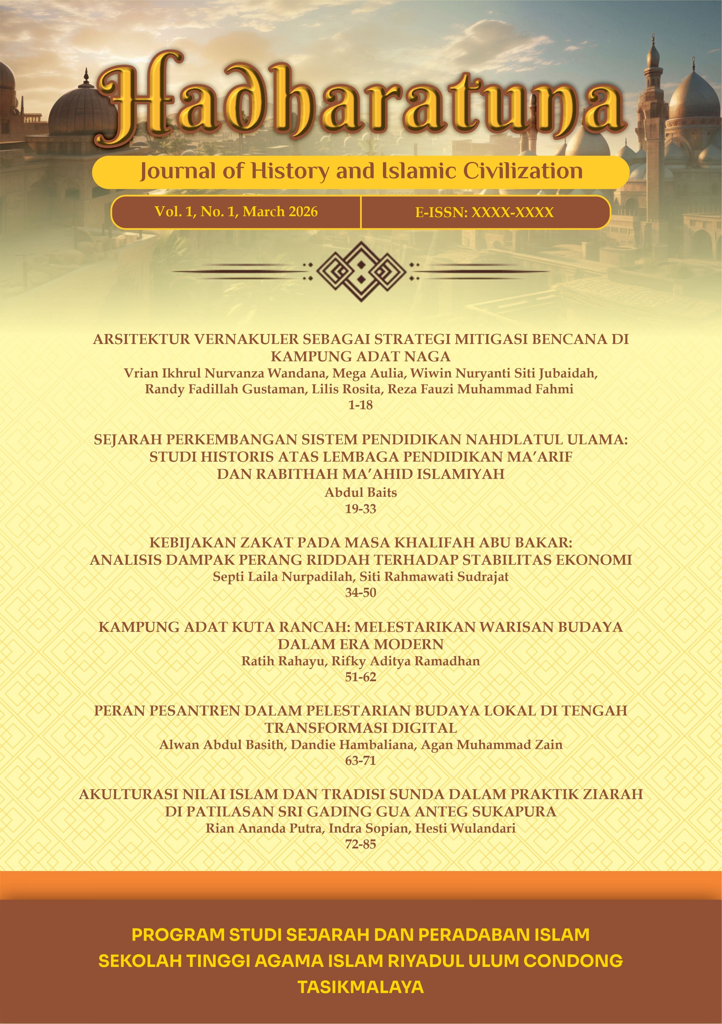 Vol. 1 No. 1 (2026)This edition presents a collection of scholarly articles exploring the relationship between Islam, local culture, and social dynamics in both historical and contemporary contexts in Indonesia. The contributors come from various academic institutions, including Siliwangi University, STAI Riyadul Ulum Condong, STIT Az Zahra Tasikmalaya, Indonesia Open University, Universitas Muhammadiyah Sukabumi, and Sunan Gunung Djati State Islamic University Bandung. The articles address topics such as vernacular architecture for disaster mitigation, the development of Nahdlatul Ulama’s educational system, zakat policy during Abu Bakr’s caliphate, cultural preservation in Kampung Adat Kuta, the role of pesantren in the digital era, and the acculturation of Islamic and Sundanese traditions in pilgrimage practices. Overall, this edition highlights interdisciplinary insights linking history, Islamic education, local culture, and community resilience, with both theoretical and practical relevance.